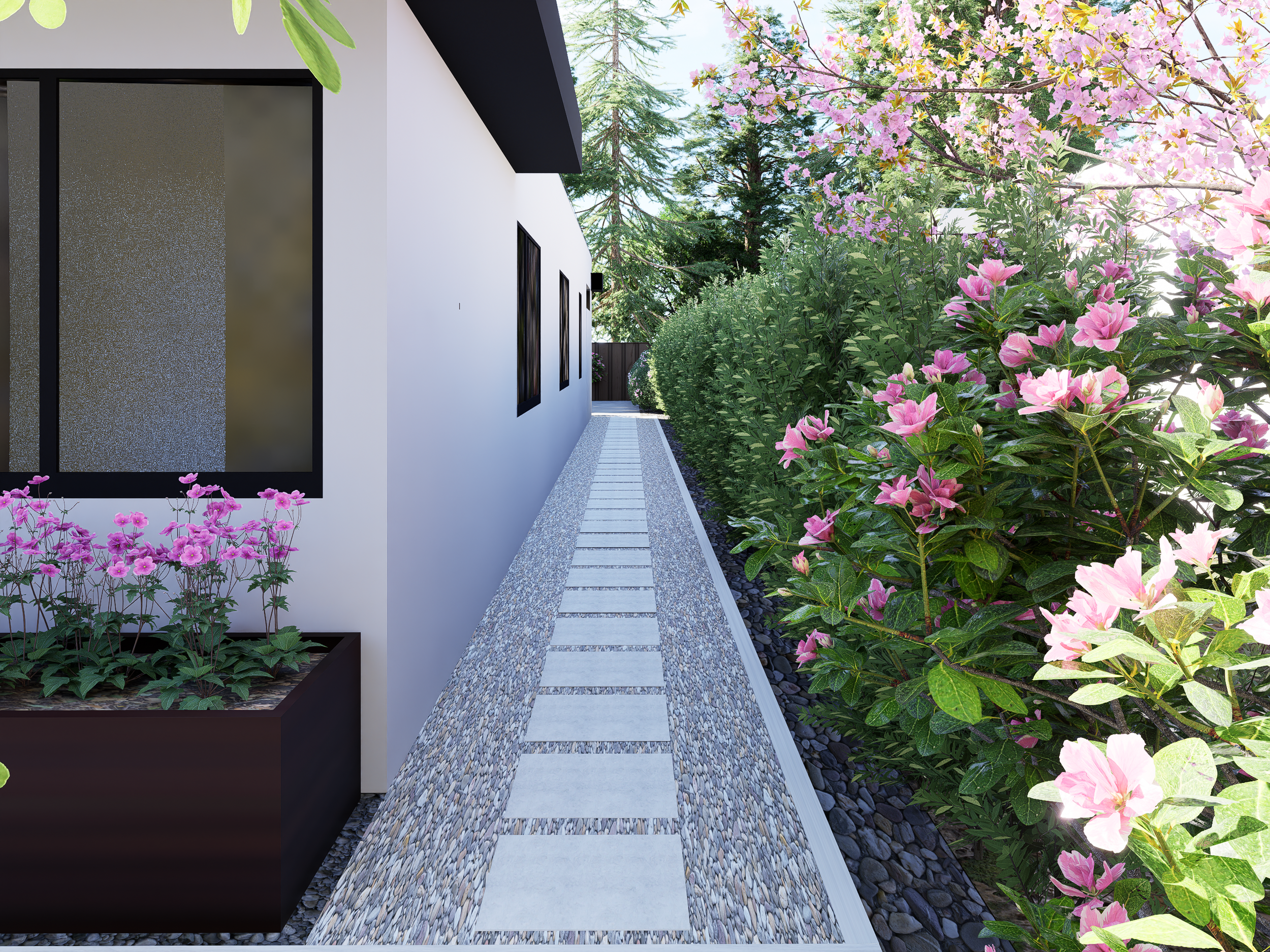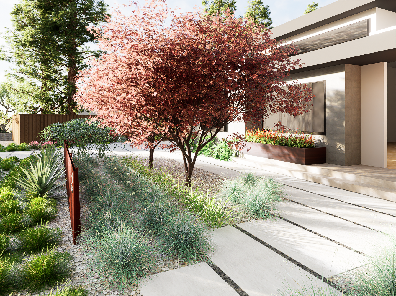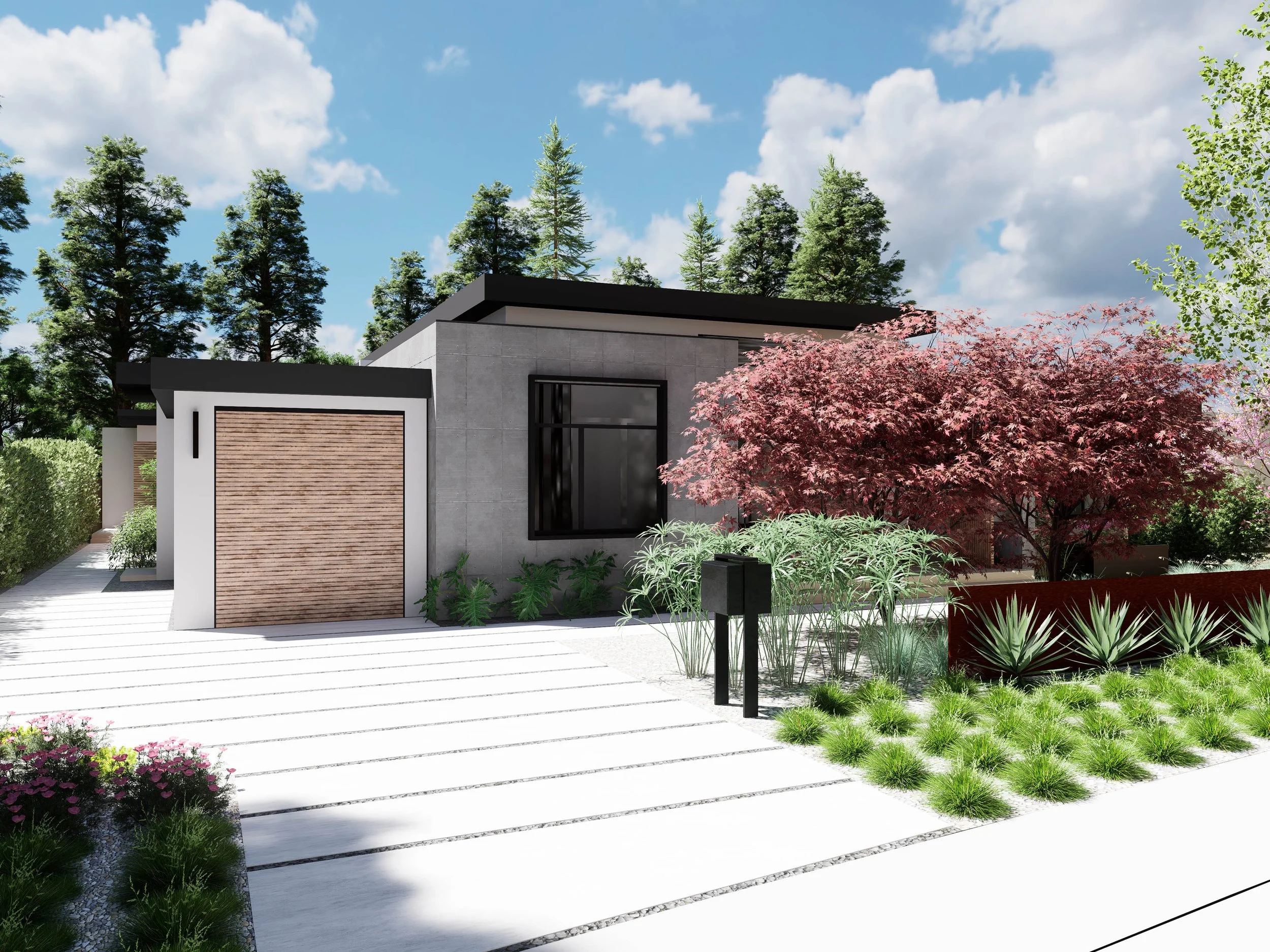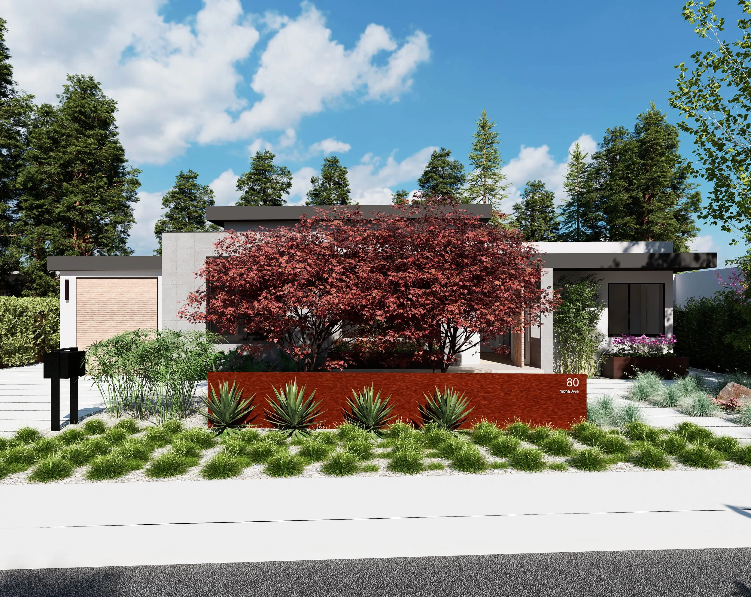 Featuring screening maple trees and a privacy threshold wall, the landscape design echoes the relationship between public and private space. By using distinct plant types to flank the free-standing wall, the design creates a clear separation for the client's frontage. The maple trees are strategically mirrored in front of the living room, blocking unsightly views of the neighborhood while providing a serene, natural outlook