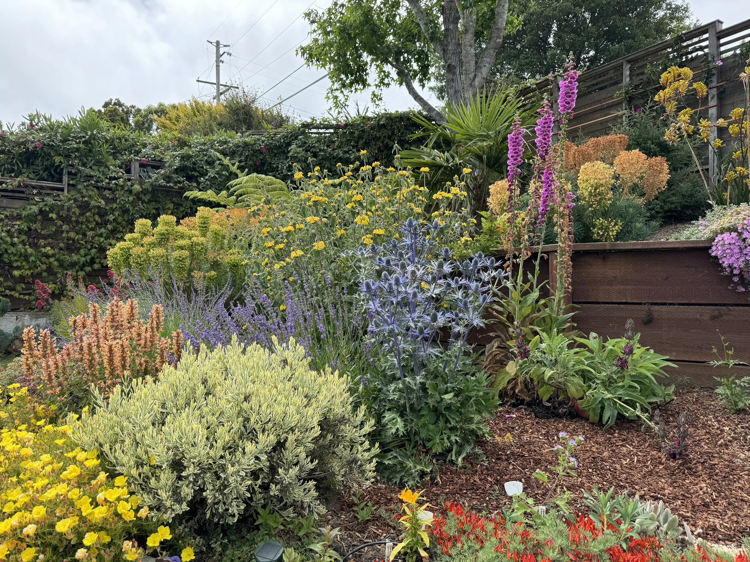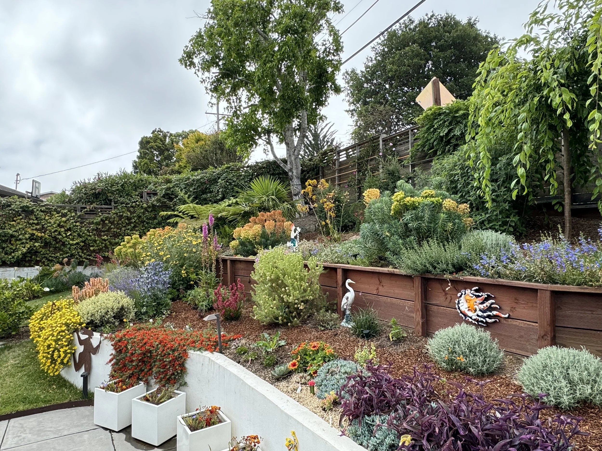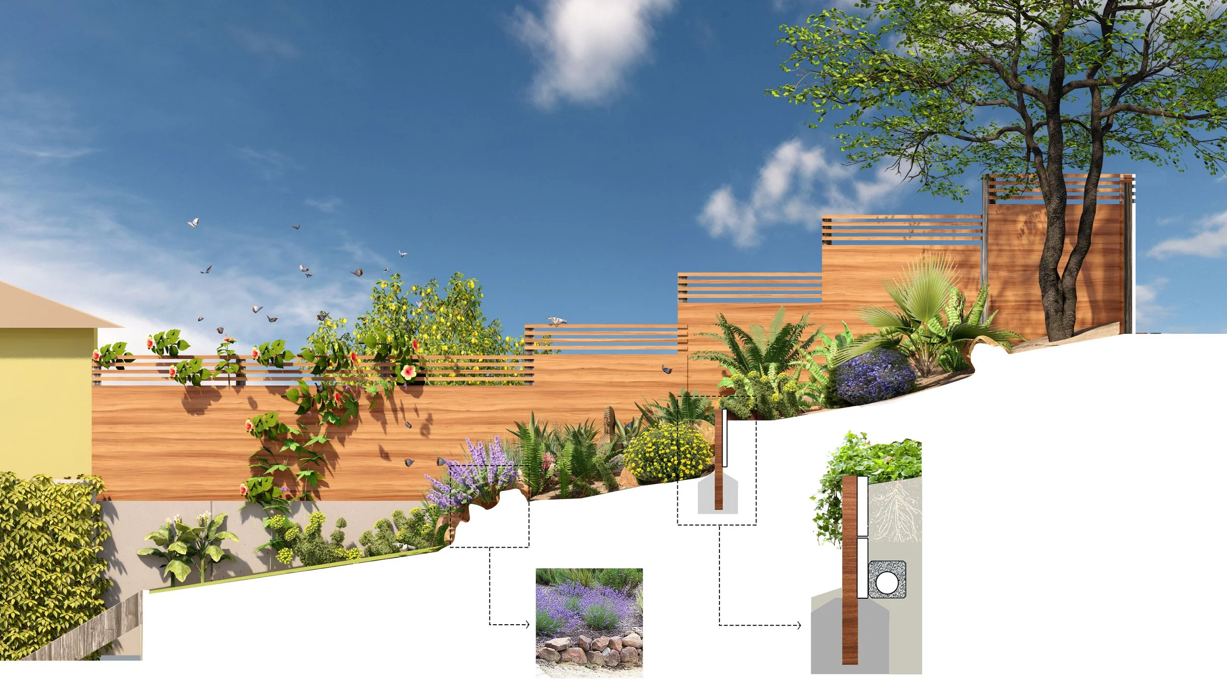 The garden site is on a 1:3 slope, quite normal for the Bay Area houses that sit on terrain. The client agreed to add a retaining wall first to help the plants, and we marked where and how tall the wall should be.