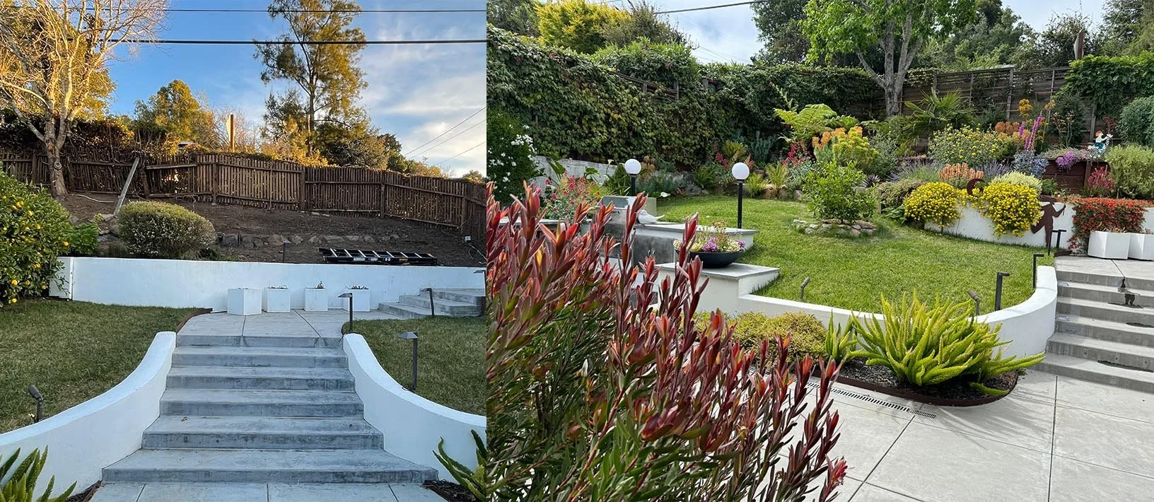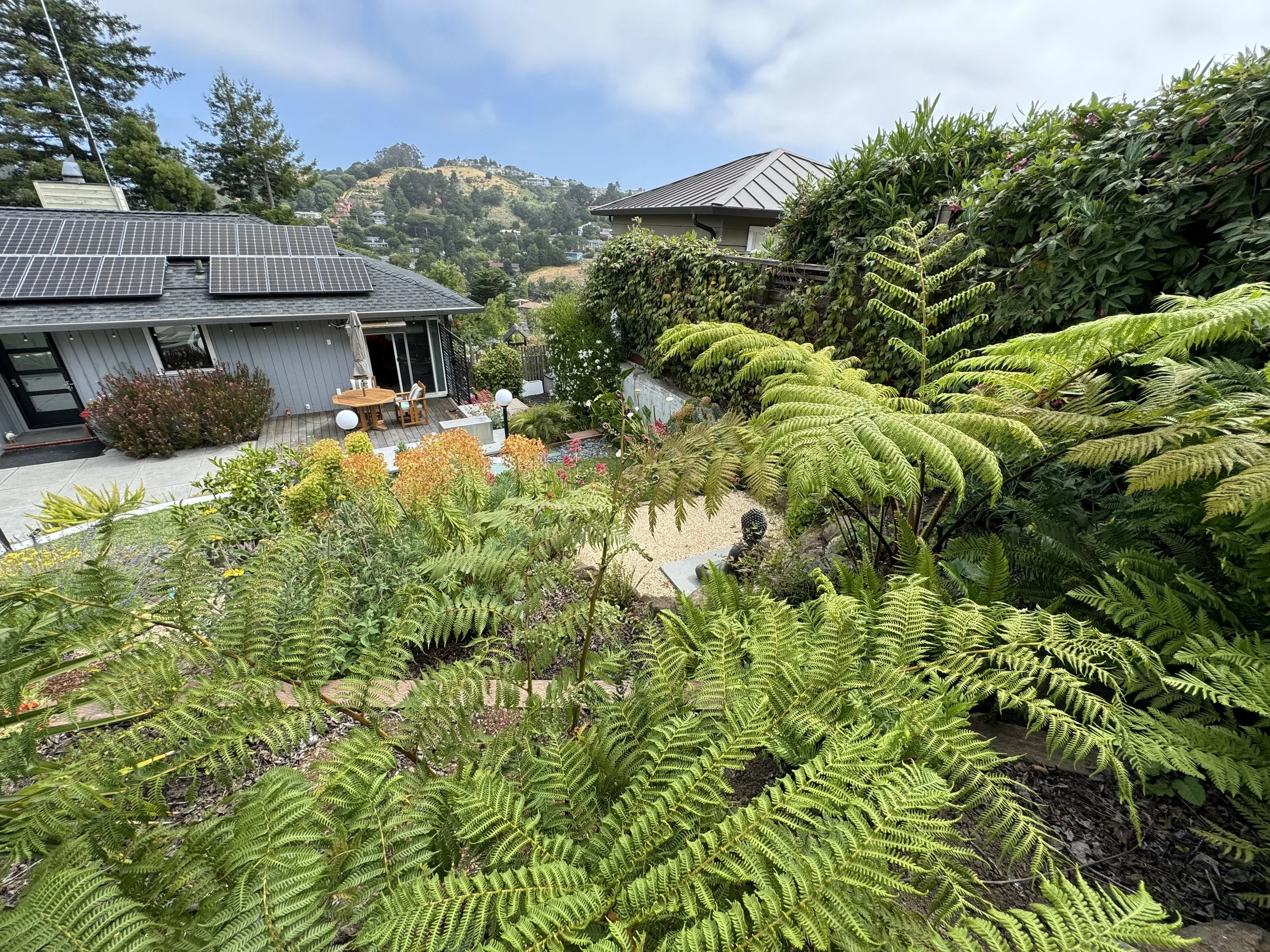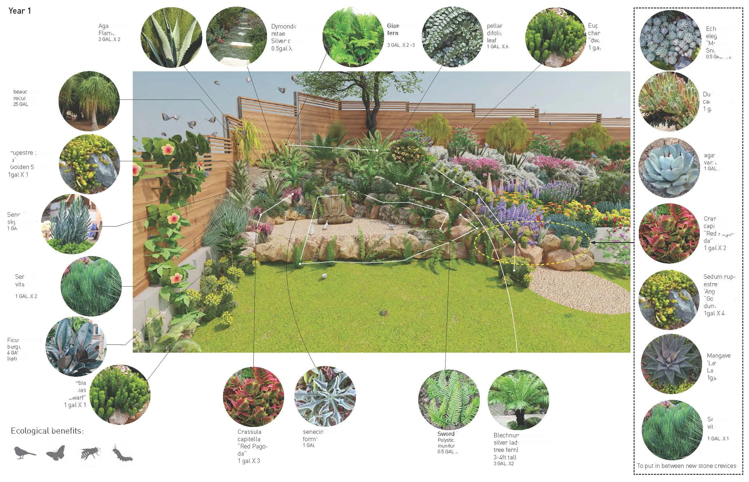 The garden site is on a 1:3 slope, quite normal for the Bay Area houses that sit on terrain. The client agreed to add a retaining wall first to help the plants, and we marked where and how tall the wall should be.