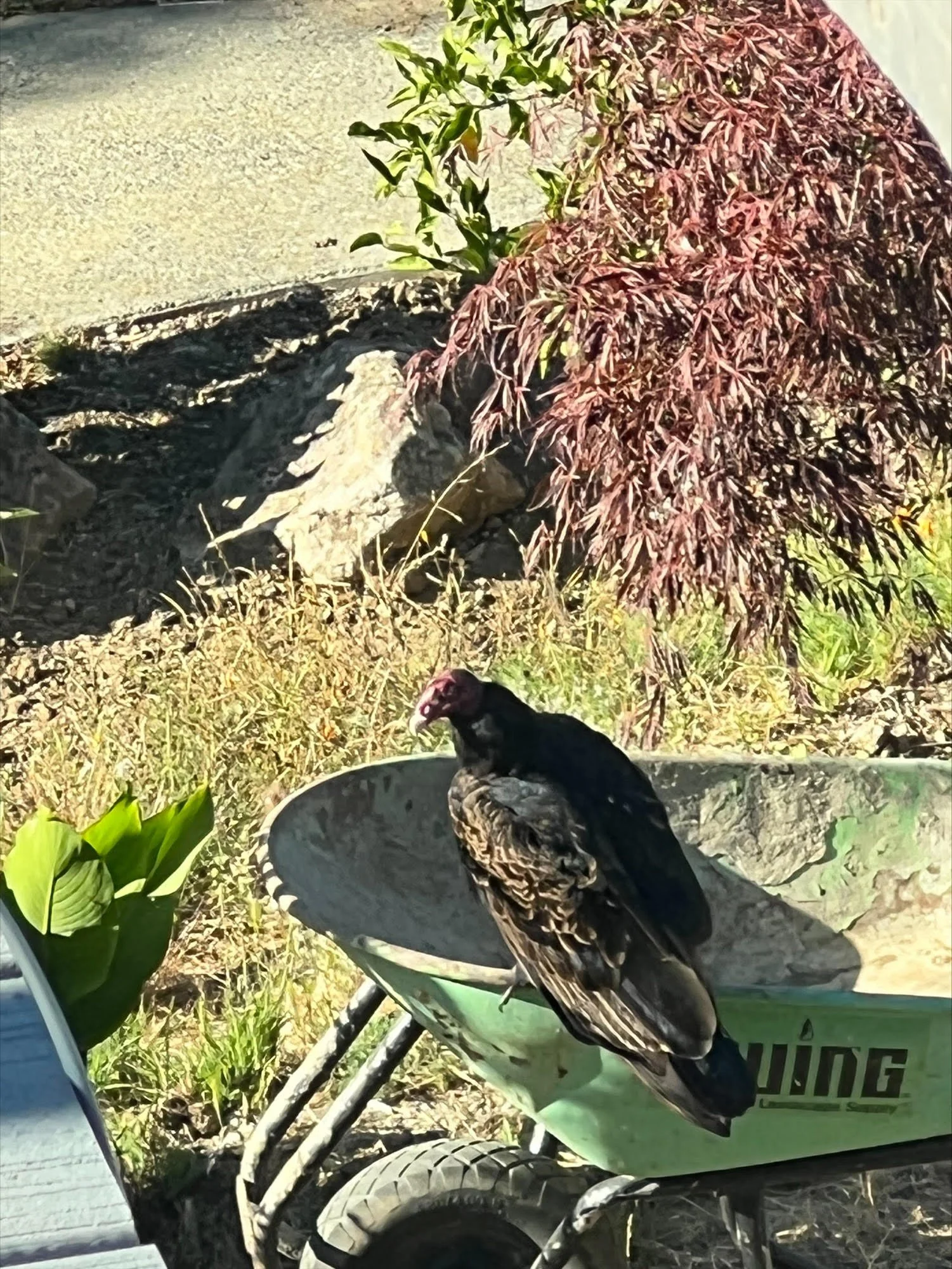 Two Vultures hung out in my yard on the wheelbarrow. Where you are working.